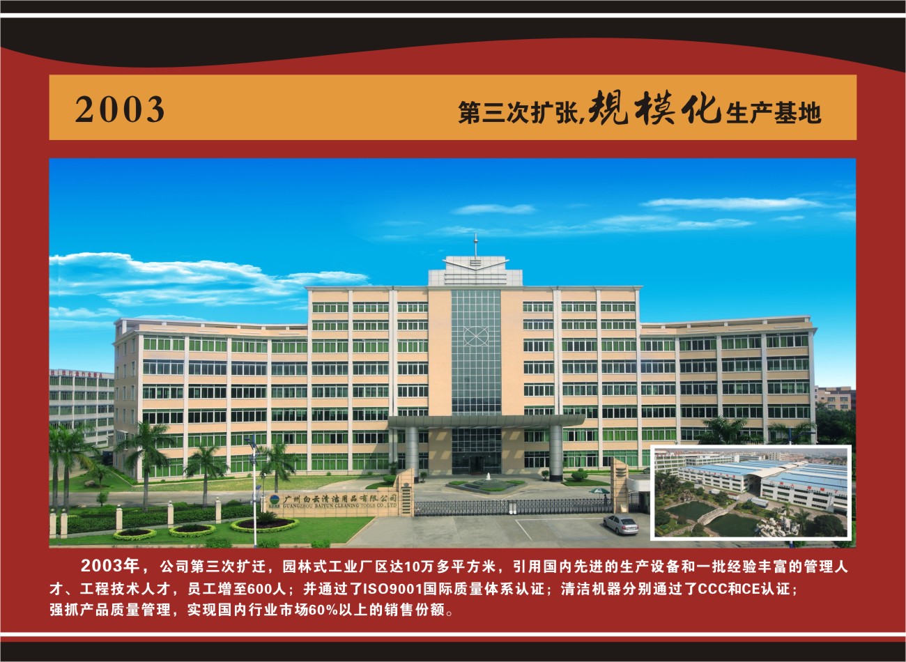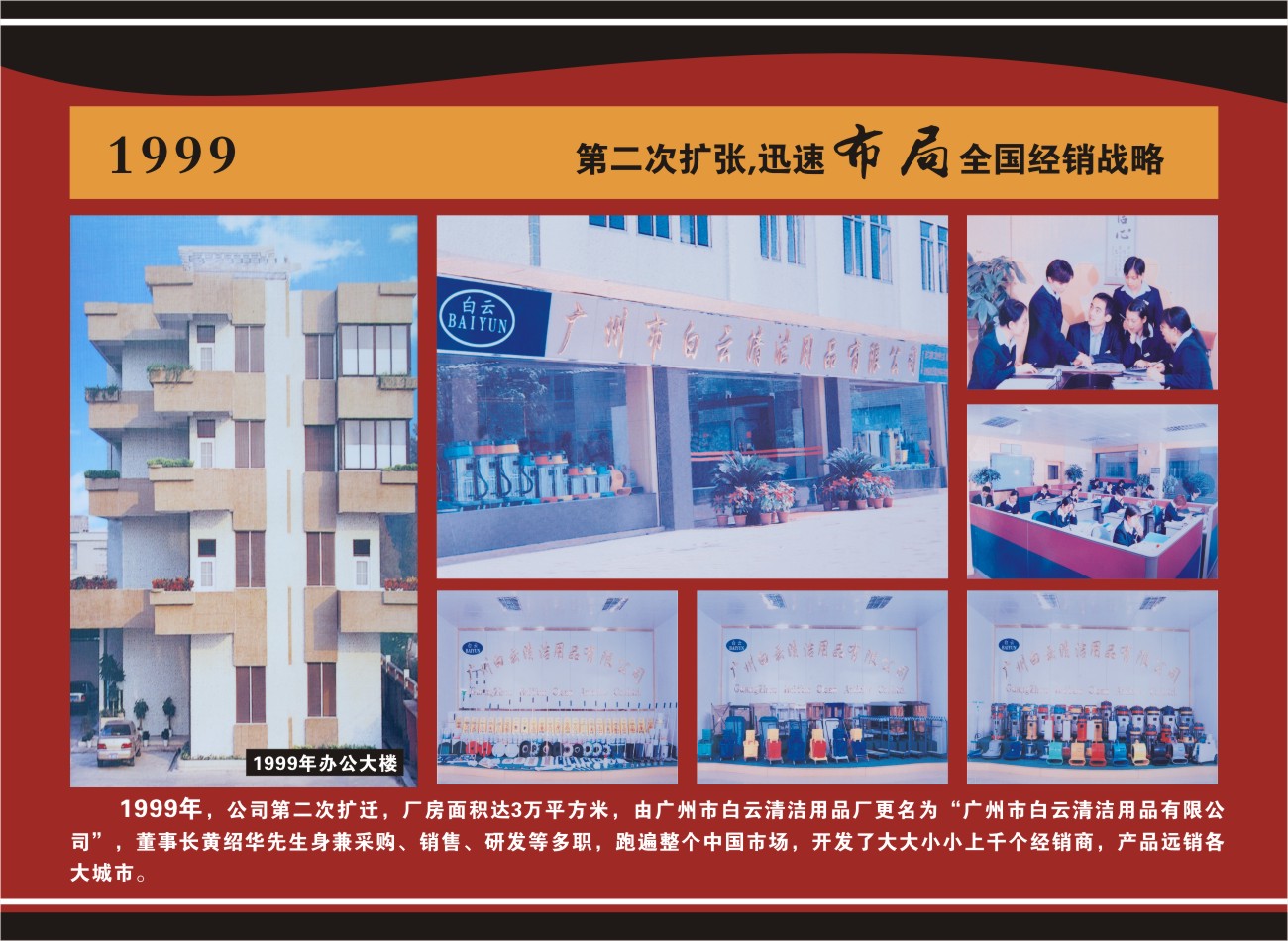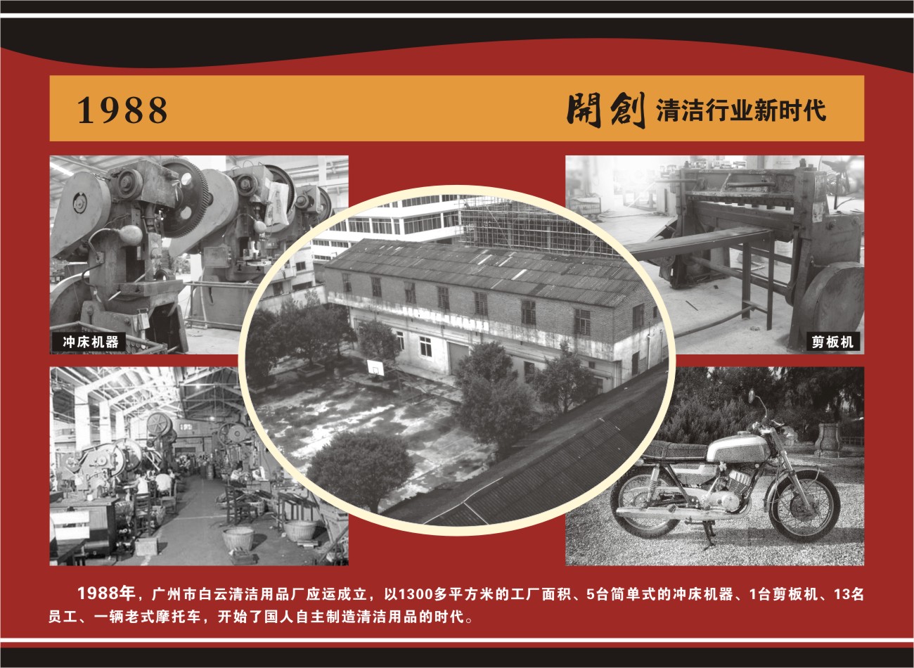 1988年,廣州市白云清潔用品廠(chǎng)應運成立了,5臺沖床、1臺剪板機和13個(gè)員工,開(kāi)始了黃紹華先生的創(chuàng )業(yè)夢(mèng)想,也開(kāi)啟了國人自主制造清潔用品的時(shí)代。當時(shí)清潔用品的概念在國人的腦海里極其模糊,特殊的歷史文化背景注定了這個(gè)行業(yè)在國內起步的艱辛和緩慢。一顆執著(zhù)的心,憑著(zhù)堅定的意志,促進(jìn)了這個(gè)新型產(chǎn)業(yè)在國內悄悄萌芽,并終于成長(cháng)為一棵清潔用品王國的蒼天大樹(shù)。