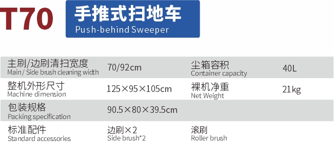 - 滾刷壓力可調節,適用于沙石、落葉等不同垃圾清掃。